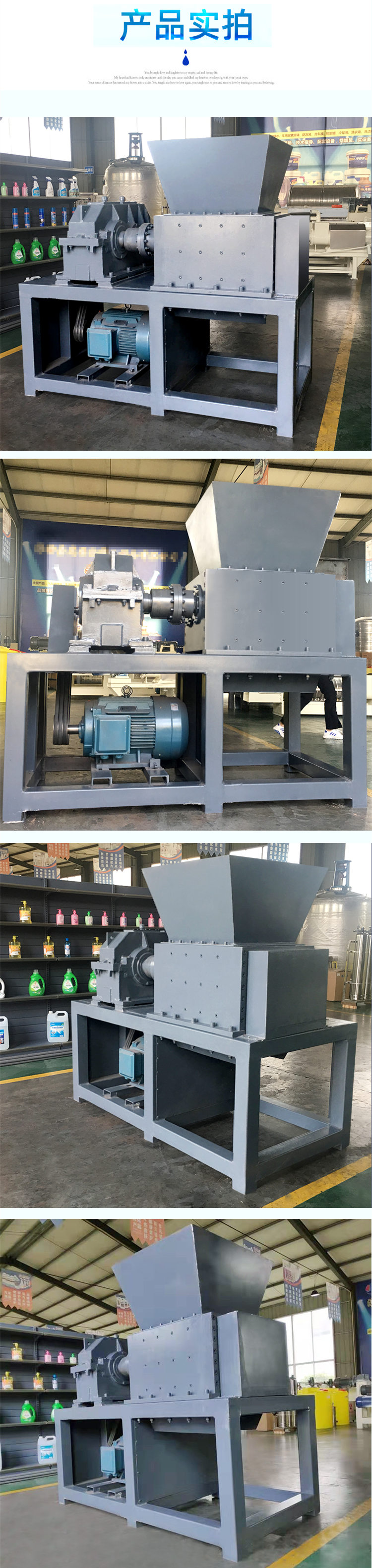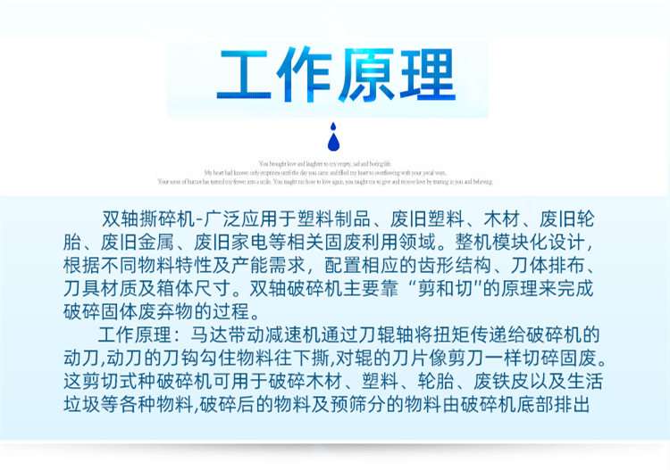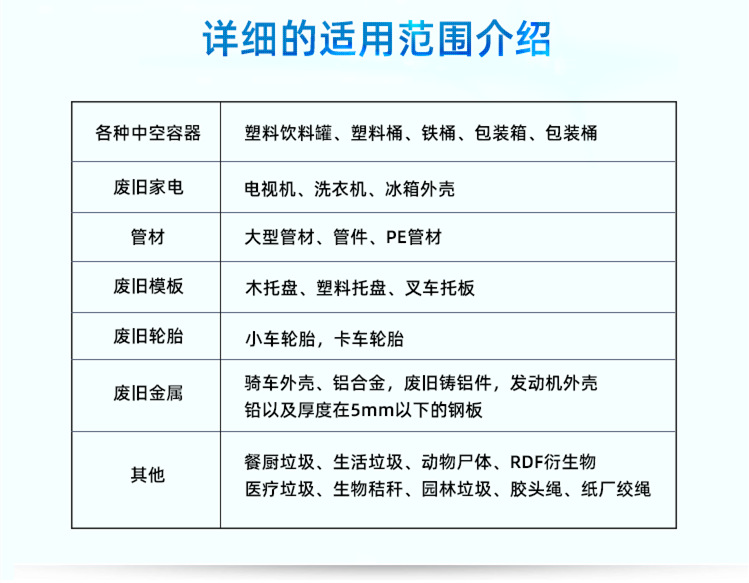 雙軸撕碎機(jī)-廣泛應(yīng)用于塑料制品、廢舊塑料、木材、廢舊輪胎、廢舊金屬、廢舊家電等相關(guān)固廢利用領(lǐng)域。整機(jī)模塊化設(shè)計,根據(jù)不同物料特性及產(chǎn)能需求,配置相應(yīng)的齒形結(jié)構(gòu)、刀體排布、刀具材質(zhì)及箱體尺寸。雙軸破碎機(jī)主要靠“剪和切"的原理來完成破碎固體廢棄物的過程。